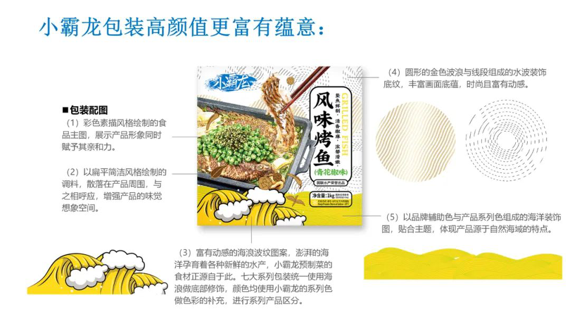 小霸龙升级后品牌定位为海鲜预制菜精选品牌,将聚焦预制菜产品,如风味烤鱼、调味小龙虾、水晶虾饺等,拥有7大系列预制菜。焕新品牌形象后,小霸龙用一个欢乐、鲜潮、充满爱及生命力的形象面向新消费群体,走入大都市人群的忙碌生活中,以“打造消费者最亲密的饭友”为品牌理念。